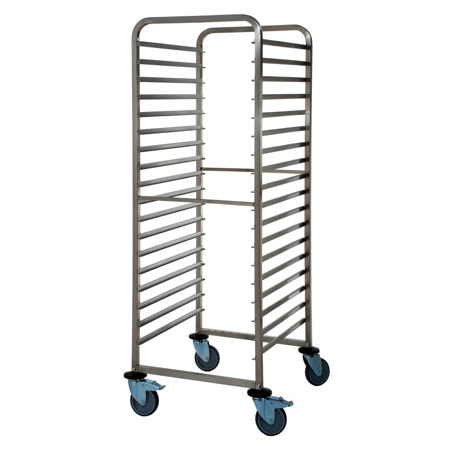 Cadre en acier inox, glissières en forme U avec butée d’arrêt. 4 roulettes pivotantes dont 2 avec frein, protège-murs.